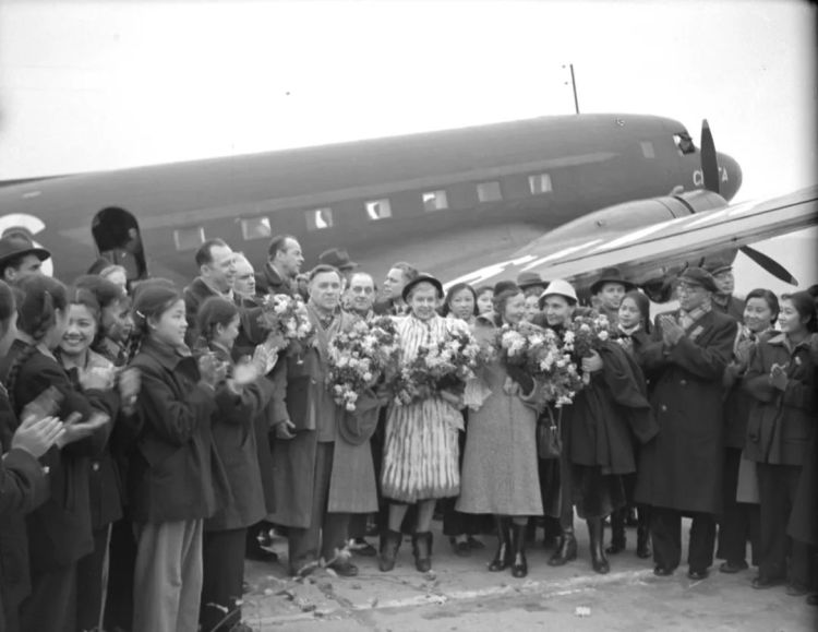 ↑应邀参加“中苏友好月”的苏联电影艺术工作者代表团团长费道罗夫一行、苏联艺术工作团团员乌兰诺娃等艺术家抵达北京,在机场受到中国文化界、电影界人士热烈欢迎。(1952年11月6日,袁浩)