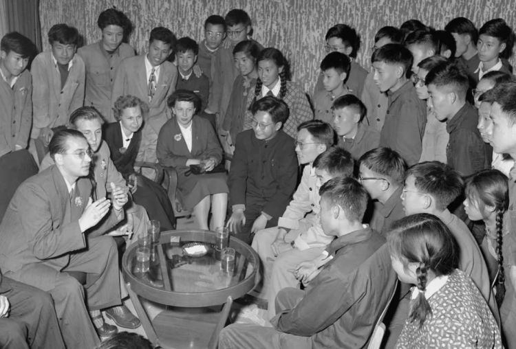 ↑共青团员们在上海举行联欢会,庆祝十月革命40周年。这是上海学生和苏联青年代表保尔·沙柯夫等交谈。(1957年11月5日,杨溥涛)