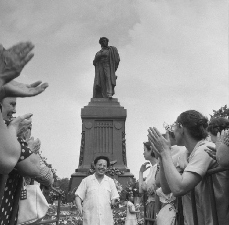 ↑莫斯科群众欢迎一位中国老师用俄语和中文朗诵普希金的诗歌。 (1986年,伊戈尔·佐京)