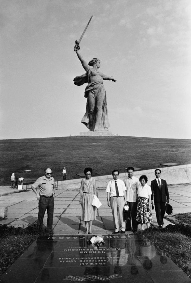 ↑中国记者在伏尔加格勒马马耶夫山岗合影。 (1987年,塔斯社稿)