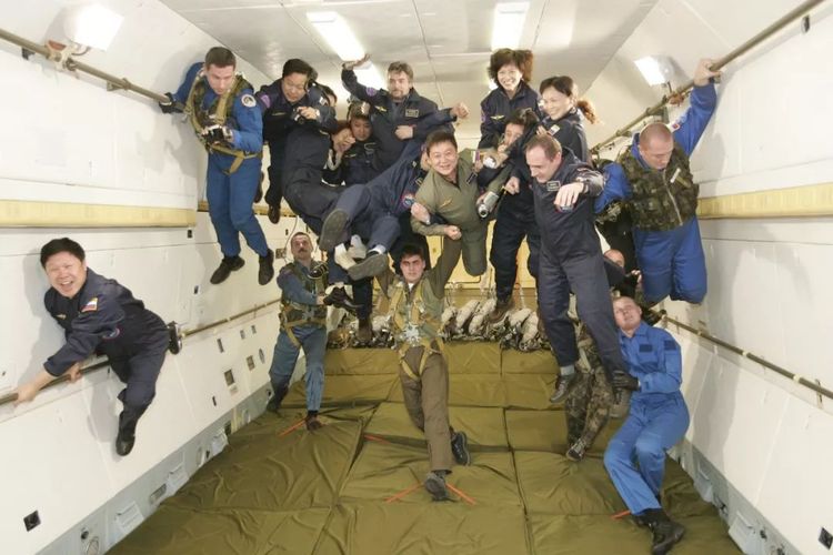 ↑在俄罗斯首都莫斯科的加加林阿特拉斯宇航中心,10名中国游客在俄罗斯宇航员的保护下体验太空失重训练。(2004年12月17日,陈建力)