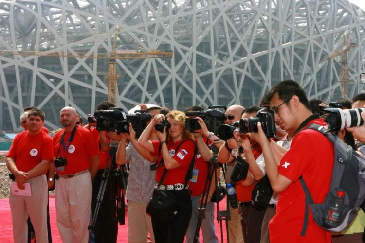 ↑参加“中俄友谊之旅·中国行”报道组的中俄两国媒体记者在北京奥体中心采访。(2007年6月25日,李明放)