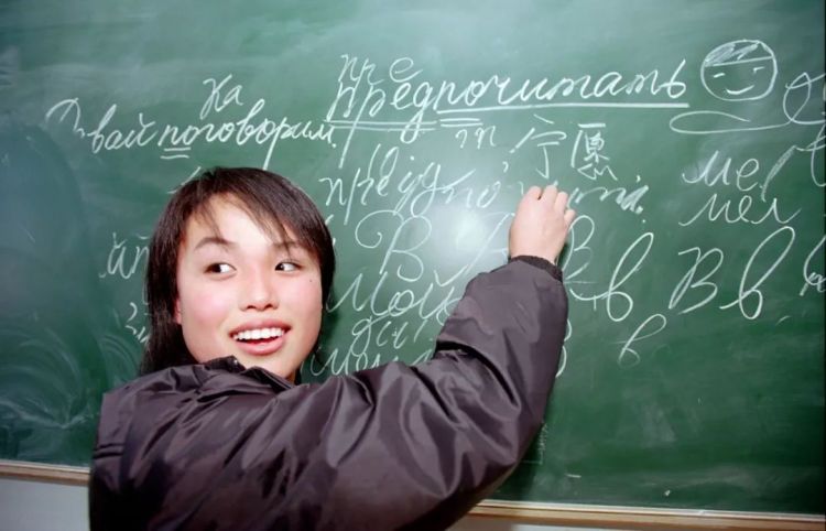 ↑中国满洲里的一位老师在给学生上俄语课。 (2004年,叶夫格尼·叶潘钦采夫)
