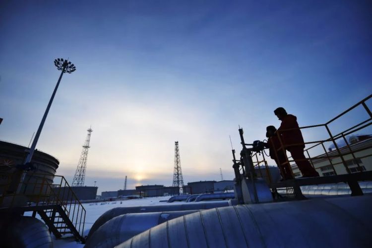 ↑黑龙江大庆,两名工人在刚刚投产的中俄原油管道林源输油站巡检。(2011年1月10日,王建威)