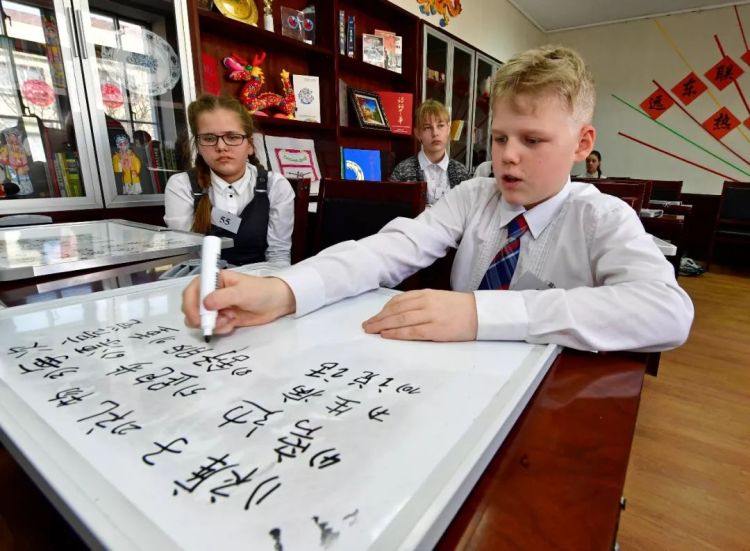 ↑俄罗斯学生在符拉迪沃斯托克远东联邦大学孔子学院书写汉字。(2017年,尤里·斯米秋克)