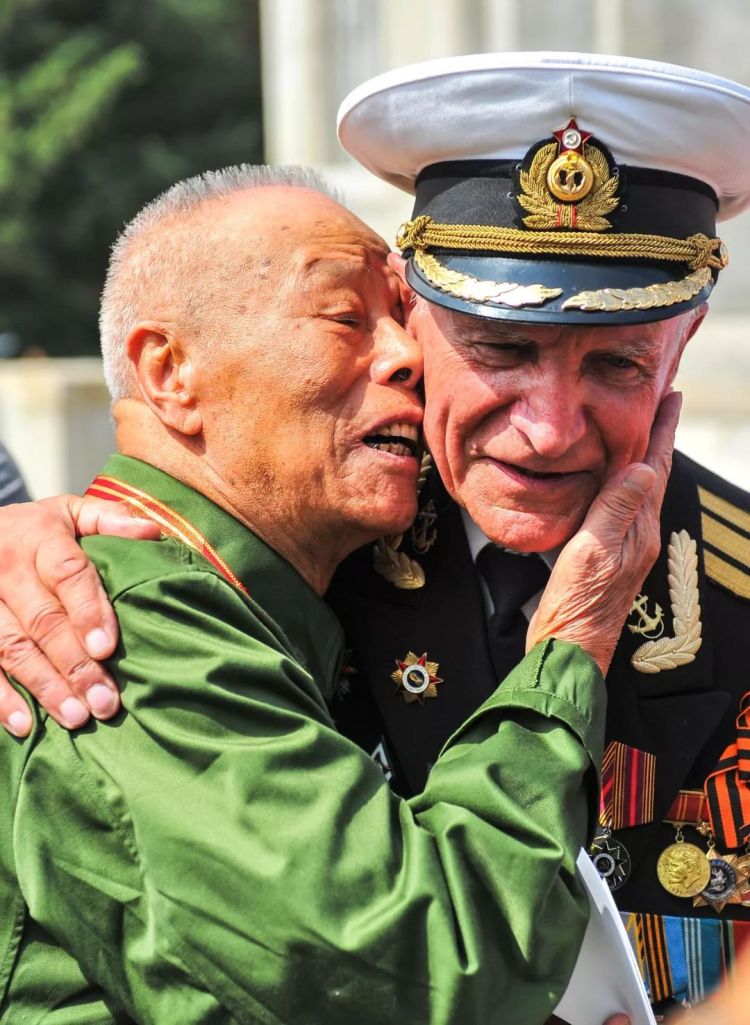 ↑吉林长春,中俄双方抗战老战士在祭奠苏联红军烈士活动上相拥。(2015年9月2日,许畅)