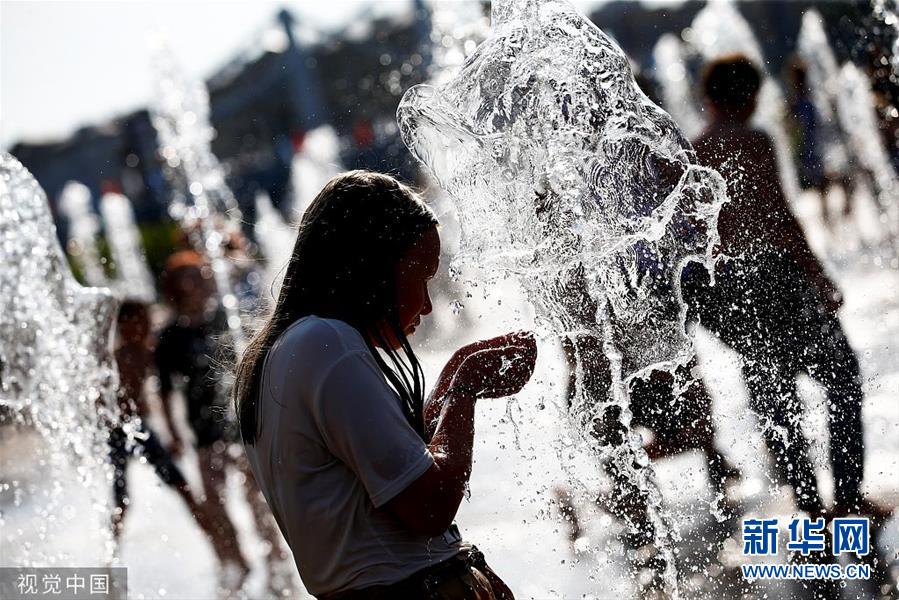 当地时间2019年6月11日,俄罗斯莫斯科,气温高达39摄氏度,民众喷泉戏水降温。(图片来源:视觉中国)