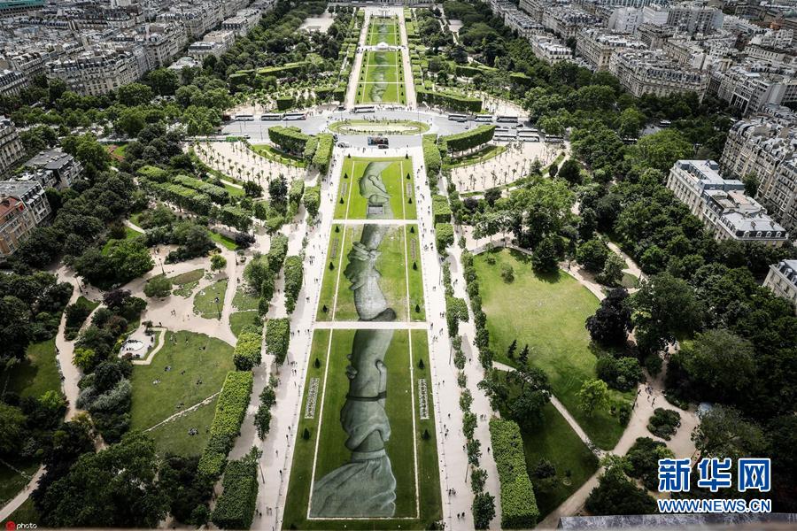 当地时间6月14日,法国巴黎,法国街头艺术家Saype在埃菲尔铁塔附近展示了他的巨型艺术品“Beyond Walls”,通过在神战广场的草坪上绘就连环相扣的手,表达出自己对于打破一切藩篱的思考。(图片来源:东方IC)