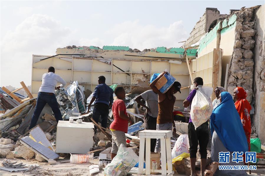 6月15日,在索马里首都摩加迪沙,人们从汽车炸弹袭击损坏的房屋中清理物品。新华社发(哈桑 摄)