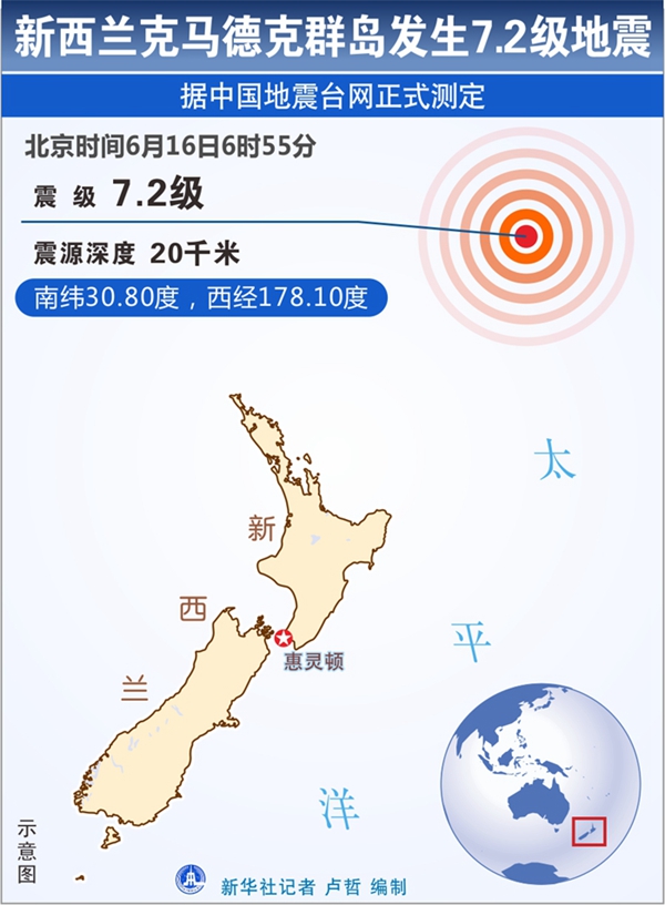 新华社快讯:中国地震台网正式测定,6月16日6时55分,在新西兰克马德克群岛(南纬30.8度,西经178.1度)发生7.2级地震,震源深度20公里。