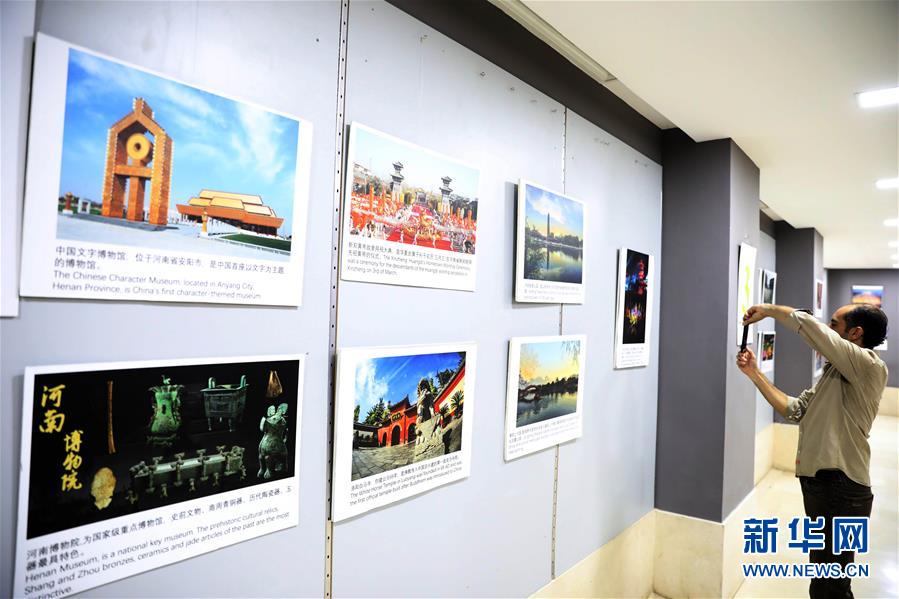 6月22日,在埃及首都开罗,一名男子参观中国河南旅游图片展。新华社发(艾哈迈德·戈马 摄)
