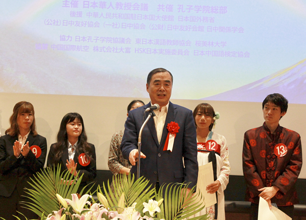 孔铉佑在致辞中赞扬了18名选手的中文水平。他表示,国家之间的友好不能离开人民的彼此交流。中国有大量年轻人想学习日语,日本也有不少年轻人想学习中文。希望这个大学生中文演讲比赛可以成为一个跳台,年轻人通过这里,可以“跃进”到一个更高境界。