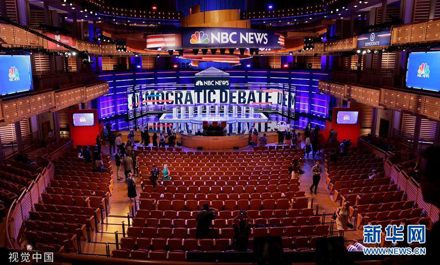 当地时间6月26日,美国佛罗里达州迈阿密,2020年总统大选民主党内初选参选人辩论即将举行,辩论场地搭建完成。美国民主党将于26日和27日,一连两天举行首轮总统选举党内初选参选人辩论,标志2020年美国总统大选进入新阶段。(图片来源:视觉中国)