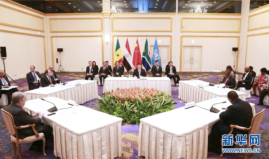 6月28日,国家主席习近平在大阪主持中非领导人会晤。中非合作论坛前任非方共同主席国南非总统拉马福萨、非洲联盟轮值主席国埃及总统塞西、中非合作论坛现任非方共同主席国塞内加尔总统萨勒和联合国秘书长古特雷斯出席。 新华社记者 庞兴雷 摄
