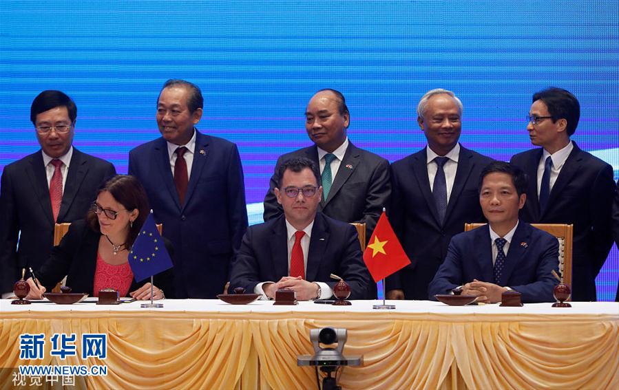 当地时间6月30日,越南河内,越南与欧盟签署自由贸易协定与投资保护协定,同意逐渐削减直至取消双边货物贸易中99%的关税。越南和欧盟于2012年正式启动自贸协定谈判,2015年就自贸协定达成原则性一致。协定签署后,还需经欧洲议会、越南国会及欧盟各成员国的内部程序批准方可生效。(图片来源:视觉中国)