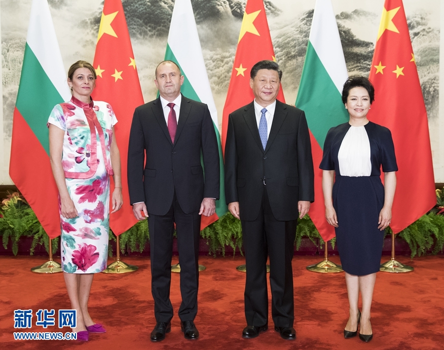 7月3日,国家主席习近平在北京人民大会堂同保加利亚总统拉德夫举行会谈。这是习近平和夫人彭丽媛同拉德夫夫妇合影。 新华社记者 黄敬文 摄