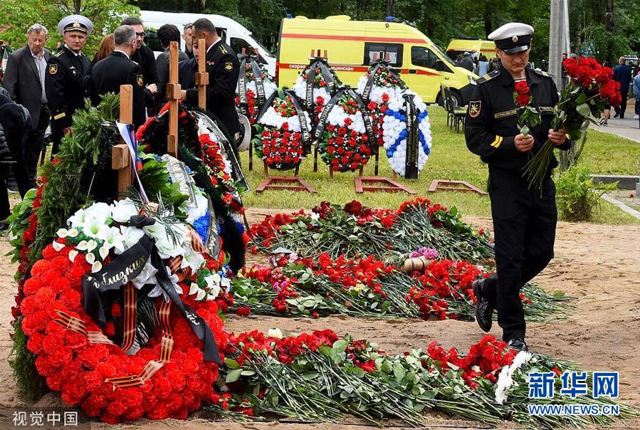 当地时间7月6日,在俄罗斯圣彼得堡,俄罗斯民众出席葬礼,悼念科考深水潜航器火灾遇难者。7月1日,俄罗斯一艘科考深水潜航器在俄水域发生火灾,导致14人丧生。(图片来源:视觉中国)