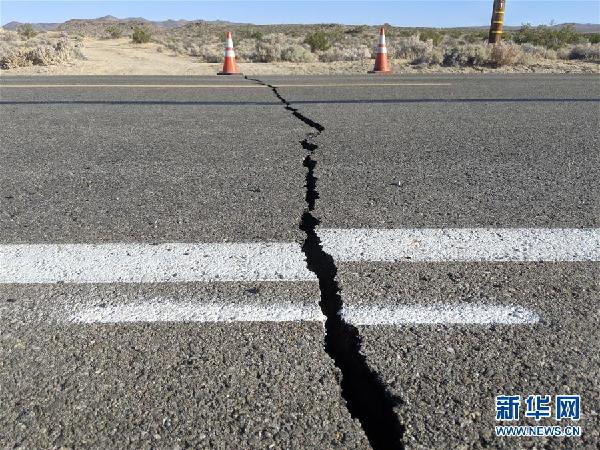 7月6日,在美国加利福尼亚州小镇特罗纳,道路在地震中受损(手机照片)。 美国加利福尼亚州南部地区4日和5日先后发生6.4级和7.1级地震,震中和附近地区遭不同程度破坏。两次强震震中所在地区圣贝纳迪诺县已经进入紧急状态。 新华社记者 檀易晓 摄