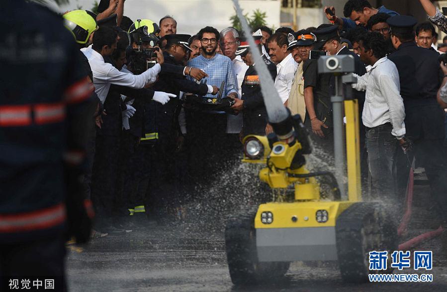 孟买消防站迎来新帮手 灭火机器人喷水亮相
