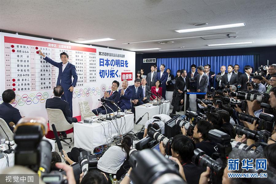 当地时间7月21日,日本东京,自民党主席安倍晋三和该党议员出席记者会。日本第25届参议院选举最终结果于7月22日凌晨全部揭晓。最终开票结果显示,自民党获得57个议席,公明党获得14个议席,加上未改选的70个议席,由自民党和公明党组成的执政联盟在参议院共有141个议席,超过半数。(图片来源:视觉中国)
