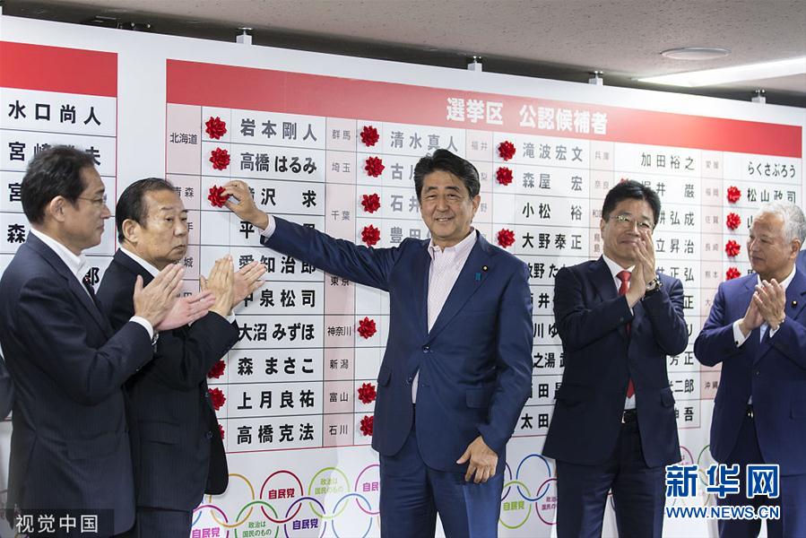 当地时间7月21日,日本东京,自民党主席安倍晋三和该党议员出席记者会。日本第25届参议院选举最终结果于7月22日凌晨全部揭晓。最终开票结果显示,自民党获得57个议席,公明党获得14个议席,加上未改选的70个议席,由自民党和公明党组成的执政联盟在参议院共有141个议席,超过半数。(图片来源:视觉中国)