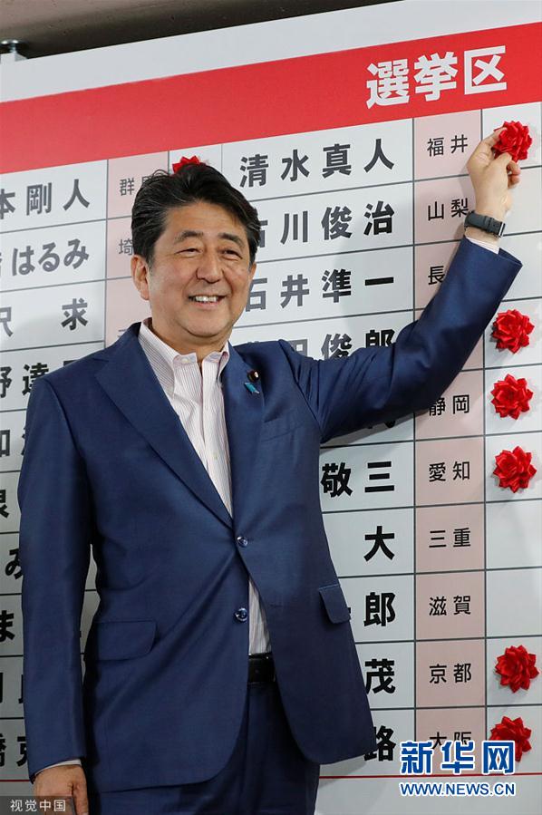 当地时间7月21日,日本东京,自民党主席安倍晋三和该党议员出席记者会。日本第25届参议院选举最终结果于7月22日凌晨全部揭晓。最终开票结果显示,自民党获得57个议席,公明党获得14个议席,加上未改选的70个议席,由自民党和公明党组成的执政联盟在参议院共有141个议席,超过半数。(图片来源:视觉中国)