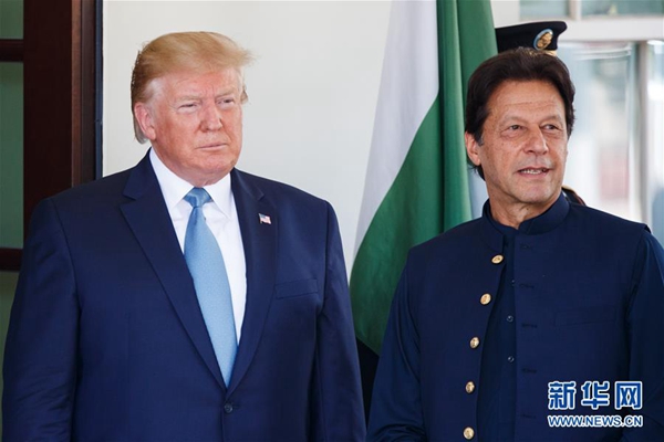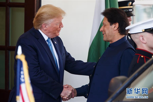 7月22日,在美国华盛顿白宫,美国总统特朗普(左)欢迎巴基斯坦总理伊姆兰·汗。新华社发(沈霆 摄)