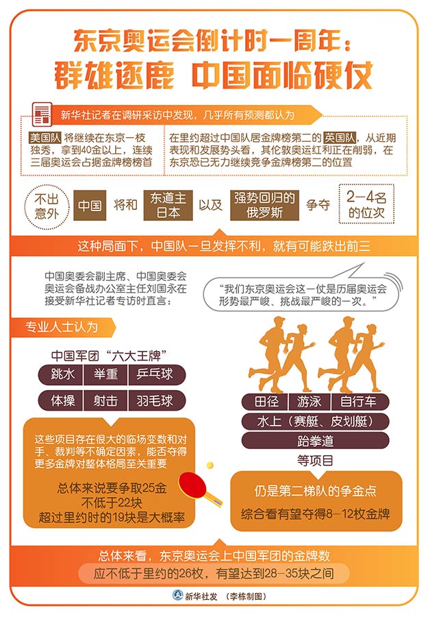 美国一家独大、日本雄心勃勃、俄罗斯励精图治、英国余威仍在,五强逐鹿东京的格局下,中国奥运军团如逆水行舟,进可与日俄上演“争二”大战;稍有不慎,也可能跌出金牌榜前三。
