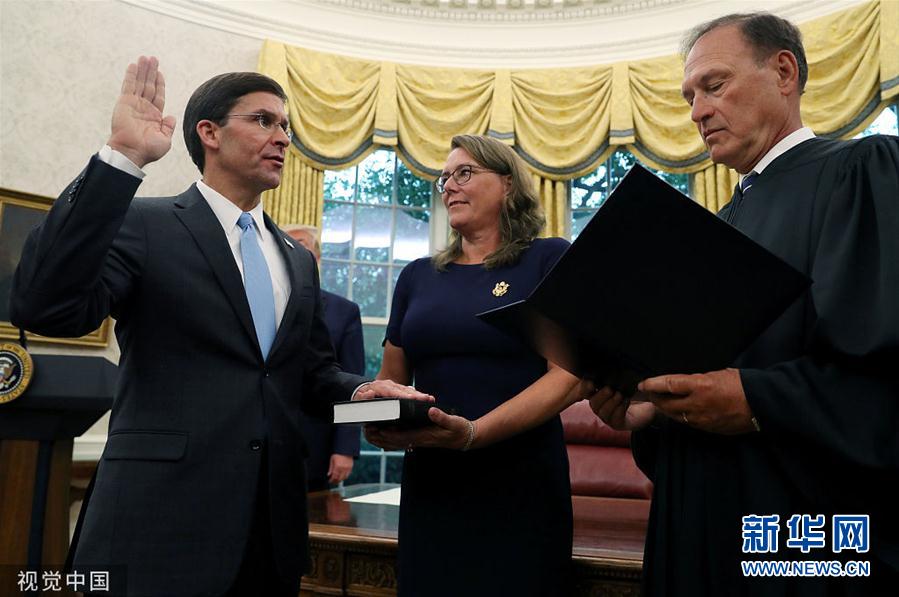 当地时间2019年7月23日,美国华盛顿特区,美国新一任国防部长马克·埃斯珀在白宫椭圆形办公室参加宣誓就职仪式,美国最高法院大法官塞缪尔·安东尼·阿利托出席。据美国《华盛顿邮报》报道,美国参议院23日投票通过任命马克·埃斯珀为美国新一任国防部长。马克·埃斯珀将在当天晚上宣誓就职。美国原国防部长詹姆斯·马蒂斯自2018年12月离职以来,国防部长一职空缺长达7个月。(图片来源:视觉中国)