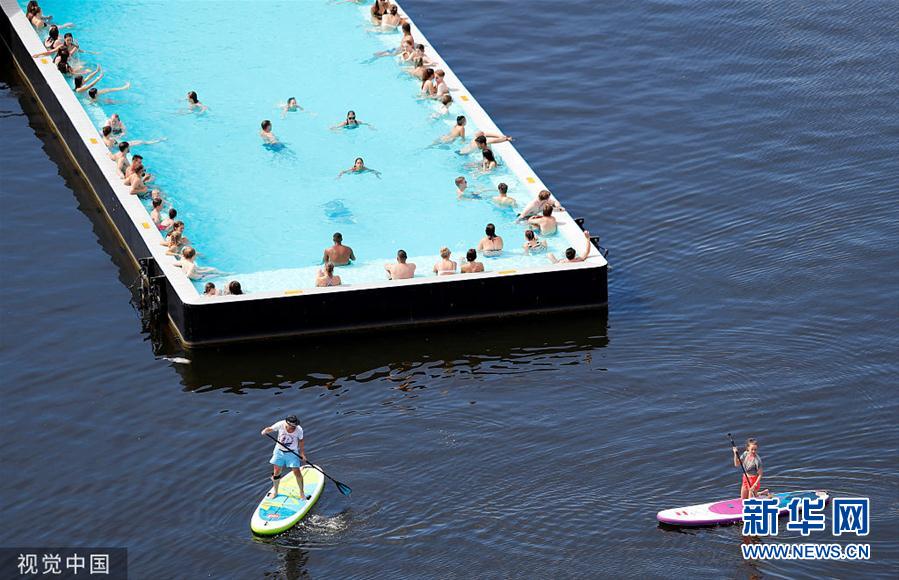 当地时间7月24日,德国柏林,当地迎来夏季高温天气。人们在泳池里玩水降温。(图片来源:视觉中国)