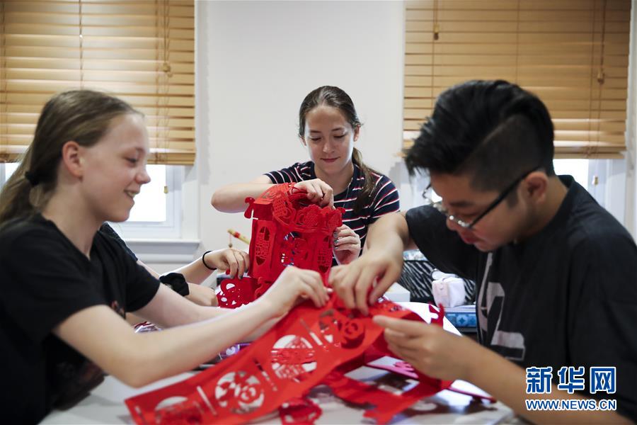 7月13日,在美国新泽西州伯纳德镇的中文指导老师家中,琳恩·贝拉特的女儿白兰(中)和白蕾(左)在制作中式灯笼。 新华社记者 王迎 摄