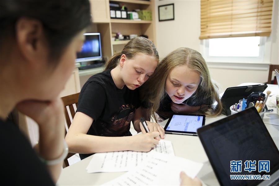 7月13日,在美国新泽西州伯纳德镇的中文指导老师家中,琳恩·贝拉特的女儿白丽(右)和白蕾在练习中文发音。 新华社记者 王迎 摄