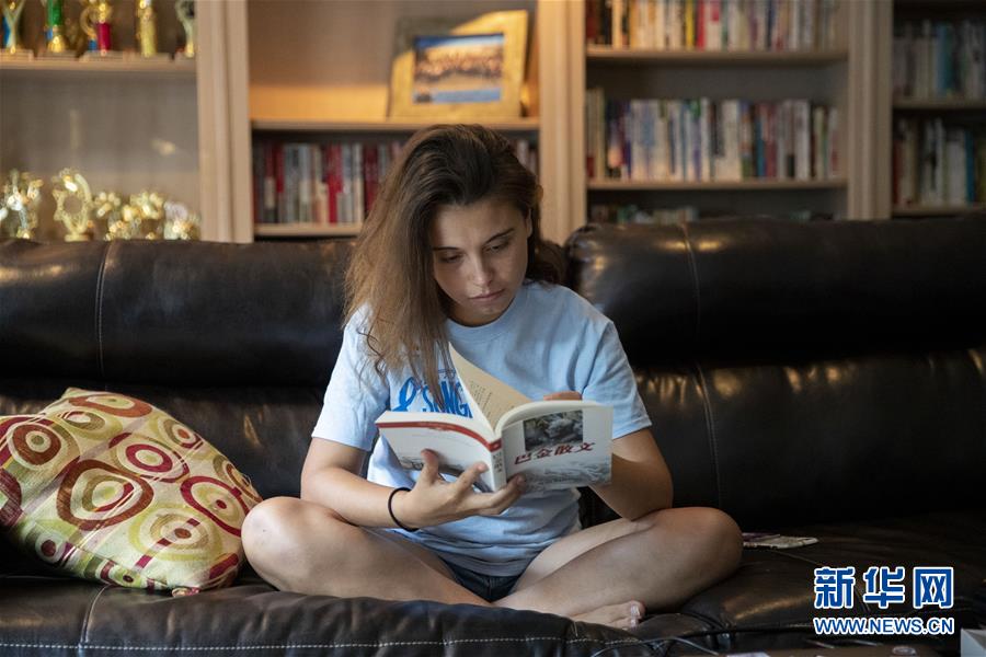 7月27日,在美国新泽西州伯纳德镇的中文指导老师家中,琳恩·贝拉特的大女儿白琳阅读中文书。新华社记者 王迎 摄
