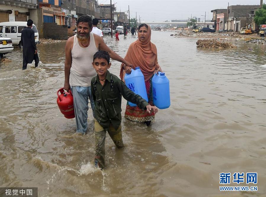 当地时间2019年8月11日,巴基斯坦卡拉奇,暴雨导致当地遭洪水侵袭。巴基斯坦国家灾害管理局副局长萨基卜·蒙塔兹11日说,从今年7月开始的暴雨已在巴全国范围内造成161人死亡,另有137人受伤。(图片来源:视觉中国)