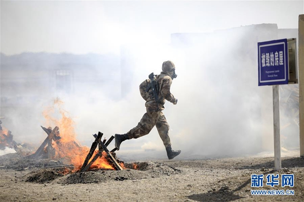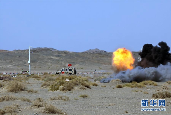 在“国际军事比赛-2019”“安全环境”项目单组赛中,中国参赛队快速通过雷爆区(8月8日摄)。新华社发(王军强 摄)