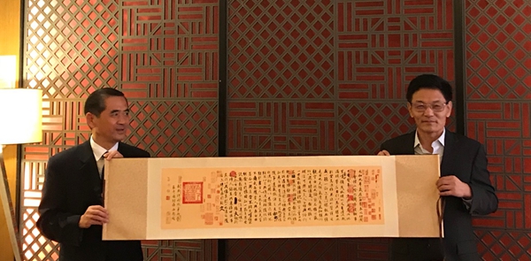 中国驻古晋总领事程广中(右)会见杜德昌主任。(图片由马来西亚中国丝路商会提供)