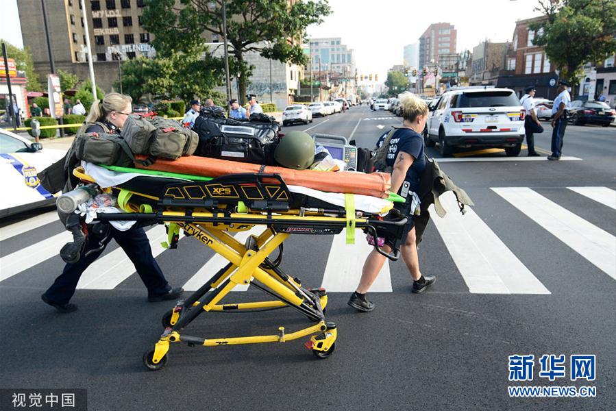 当地时间8月14日,美国费城,医护人员在枪击案现场附近推着担架车。美国东部宾夕法尼亚州费城14日发生枪击案,费城警方说已造成数名警察受伤。(图片来源:视觉中国)