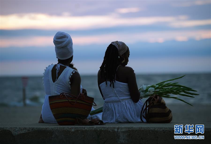 8月24日,美国弗吉尼亚州汉普顿,人们在海边举行仪式,纪念1619年第一批被奴役非洲人抵达英属北美。新华社记者 刘杰 摄