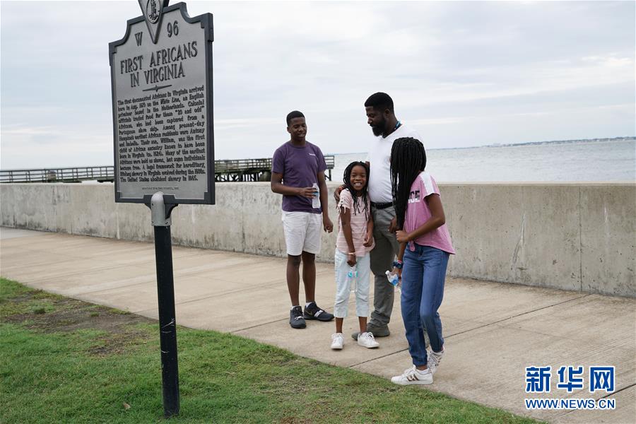 8月24日,美国弗吉尼亚州汉普顿,几名游客参观首批有记录的非洲奴隶登上英属北美海岸纪念牌。新华社记者 刘杰 摄