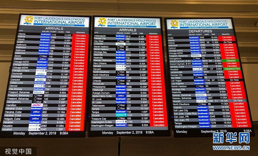 当地时间9月2日,美国佛罗里达州劳德代尔堡,当地机场的航班信息屏幕显示了被取消的航班。大西洋飓风“多里安”1日登陆大西洋岛国巴哈马,而后扑向美国。(图片来源:视觉中国)