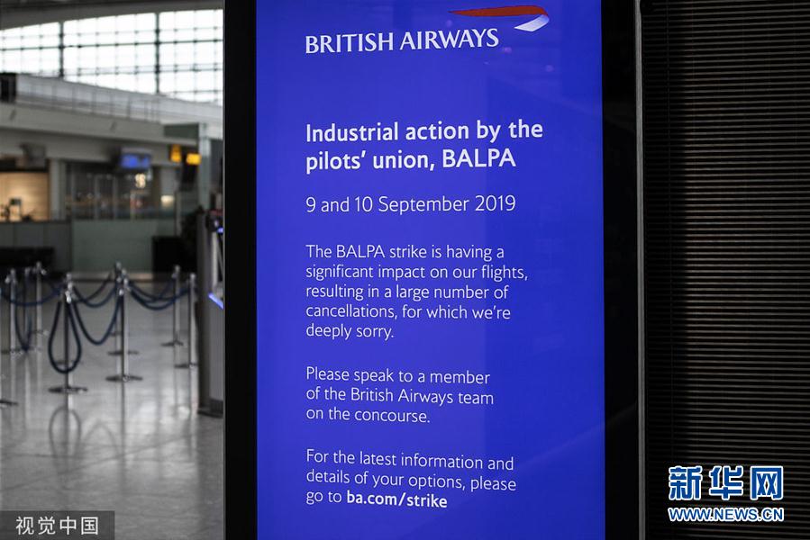 当地时间9月9日,英国伦敦希思罗机场,全球最大航空公司之一的英国航空飞行员因工资纠纷,于9日开始进行48小时罢工,导致大部分航班停飞,成千上万乘客受到影响。(图片来源:视觉中国)