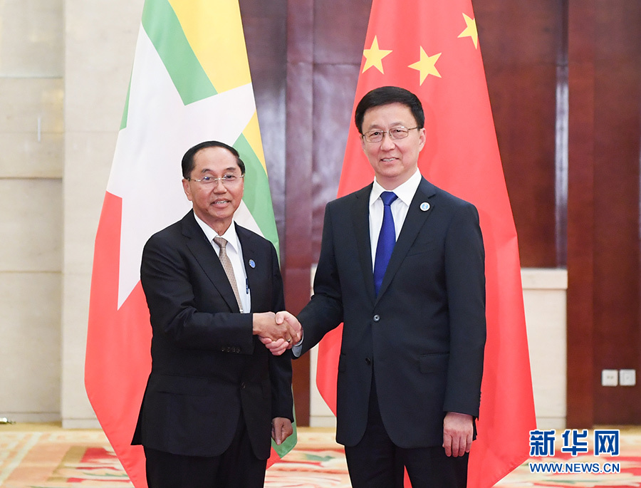 9月20日,中共中央政治局常委、国务院副总理韩正在广西南宁会见出席第十六届中国—东盟博览会和中国—东盟商务与投资峰会的缅甸副总统敏瑞。 新华社记者 申宏 摄