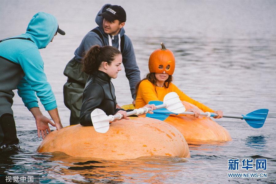 德国举办南瓜划船比赛 选手挖空南瓜当赛艇
