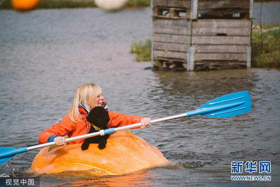 当地时间10月3日,德国科隆,科隆附近一农家旅店举办第三届南瓜划船比赛。获胜者可以得到200欧元的奖金。(图片来源:视觉中国)