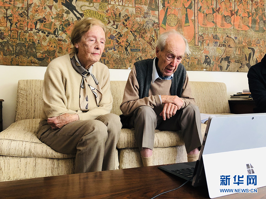 2019年6月19日,在澳大利亚堪培拉附近,内维尔·马克斯韦尔(右)在家中通过视频连线,观看在北京中国国际问题研究院举行的“马克斯韦尔图书角”揭幕仪式。新华社发(潘翔越摄)