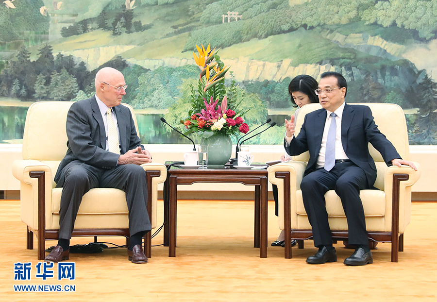 10月23日,国务院总理李克强在北京人民大会堂会见美国前财政部长保尔森。 新华社记者 姚大伟 摄