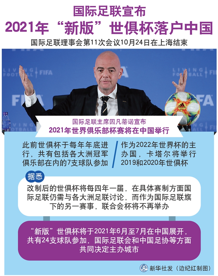 新华社上海10月24日电(记者 韦骅、马邦杰、朱翃)国际足联理事会第11次会议24日在上海结束,在会后的新闻发布会上,国际足联主席因凡蒂诺宣布,2021年世界俱乐部杯赛将在中国举行。