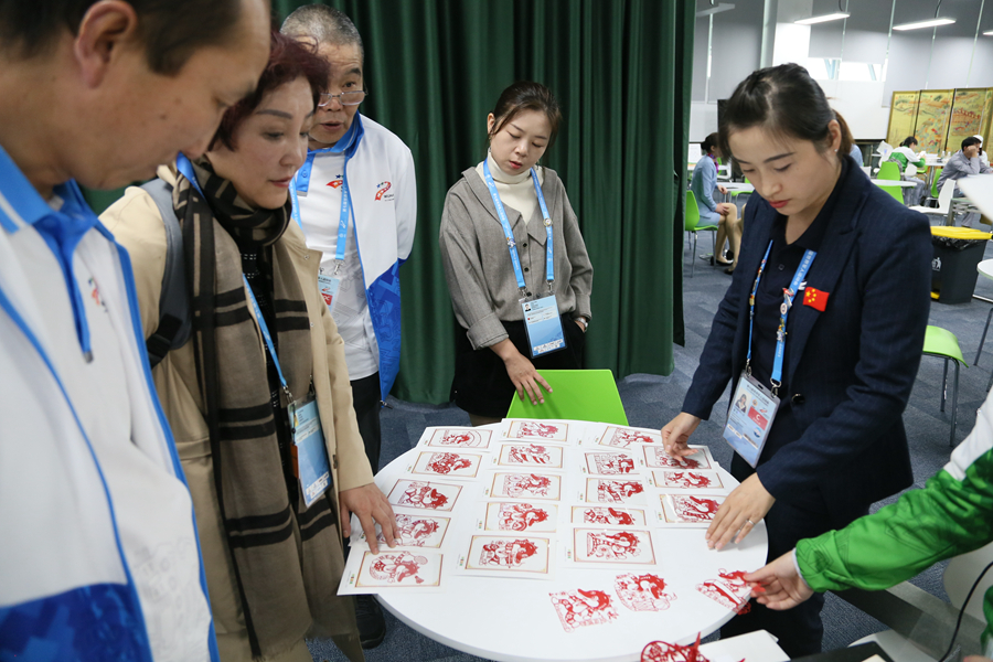 10月25日,湖北省工艺美术大师沈松柏来到第七届世界军人运动会主新闻中心展示国家级非物质文化遗产项目雕花剪纸艺术。图为艺术爱好者欣赏雕花剪纸艺术作品。新华网 连迅 摄