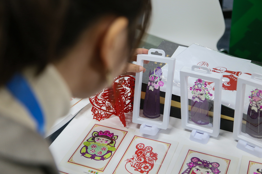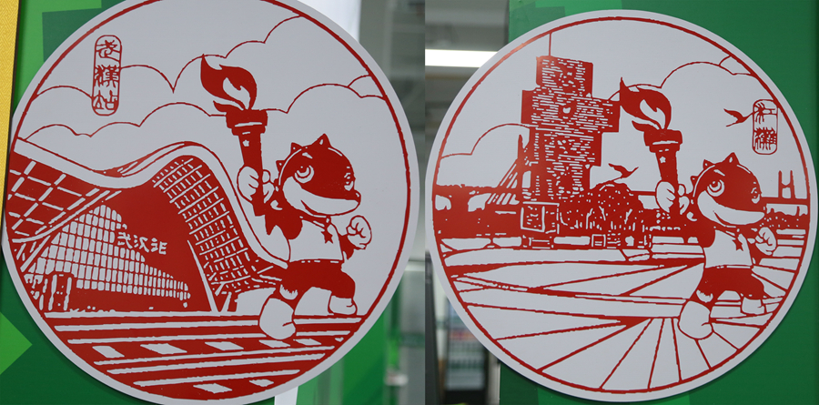 10月25日,湖北省工艺美术大师沈松柏来到第七届世界军人运动会主新闻中心展示国家级非物质文化遗产项目雕花剪纸艺术。图为沈松柏创作的包含军运会元素的雕花剪纸艺术作品。新华网 连迅 摄