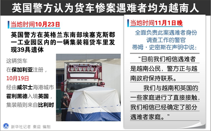 新华社伦敦11月1日电(记者张代蕾)英国埃塞克斯郡警方11月1日晚发表声明说,警方目前认为上月发生的货车惨案39名遇难者均为越南人。